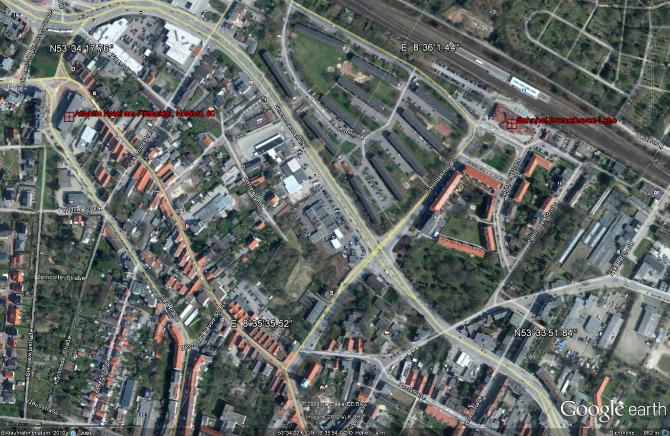 Hier seht Ihr das Atlantic Hotel am Flötenkiel und den Bahnhof-Lehe auf der Karte. |